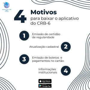 O Conselho Regional de Biblioteconomia 6ª Região (CRB-6) é o primeiro CRB brasileiro a lançar um aplicativo multifuncional para os Bibliotecários acessarem informações institucionais, certidões, notícias exclusivas, além da possibilidade de atualizar dados cadastrais e acessar serviços financeiros, como a emissão de boletos e o pagamento da anuidade por meio do cartão de crédito ou boleto bancário.