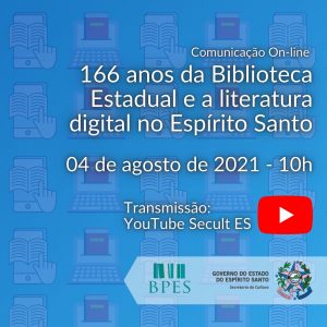 A Biblioteca Pública do Espírito Santo (BPES) promove nesta quarta-feira, 4/8, evento sobre o aniversário da instituição, a literatura digital no no estado capixaba e o Dia Nacional do Escritor, 25/7. A transmissão acontece no canal da Secretaria da Cultura (Secult) no Youtube, às 10h.