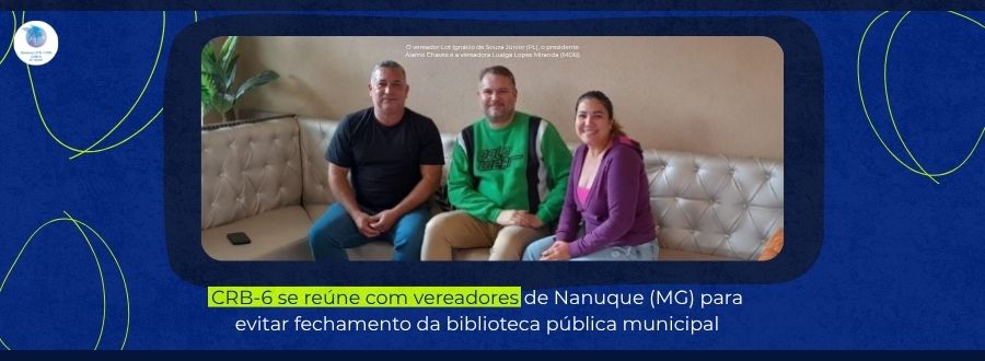 No dia 02 de agosto, o presidente do Conselho Regional de Biblioteconomia 6ª Região (CRB-6), Álamo Chaves (CRB-6/2790), reuniu-se com os vereadores Lualga Lopes Miranda (MDB) e Lot Ignácio de Souza Júnior (PL) para tratar da Biblioteca Pública Municipal Francisco Badaró Júnior, em Nanuque (MG), que vem funcionando de forma irregular nos últimos meses.