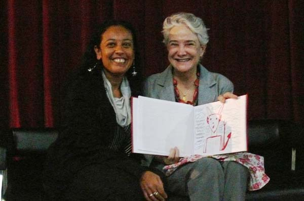 A escritora Ângela Lago, à direita, segurando releitura de seu livro “Muito Capeta” feita por Miriam, à esquerda, para o projeto “Escrevendo com o escritor”, da professora Andrea Toledo, do Chica / Foto: Arquivo Pessoal