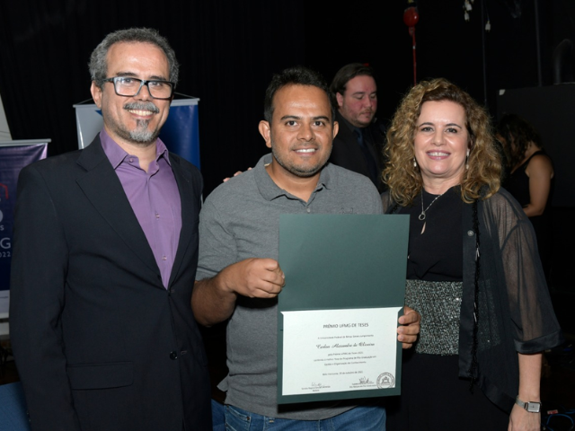 Carlos Alexandre, ladeado pelo pró-reitor Adjunto de Pós-graduação da UFMG, Eduardo Soares Neves Silva, e da reitora da UFMG, Sandra Regina Goulart Almeida