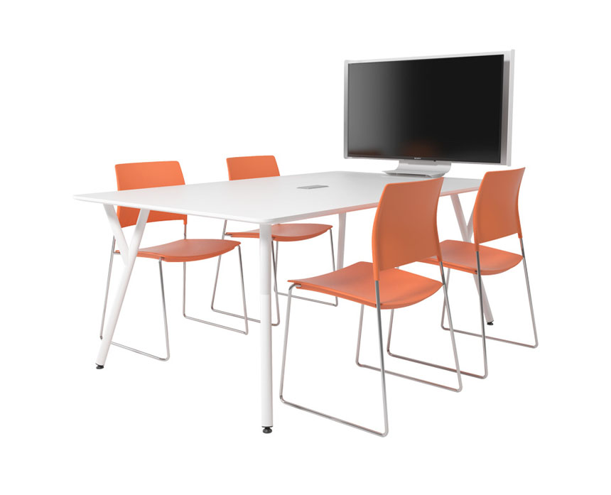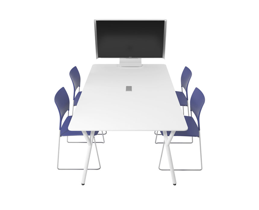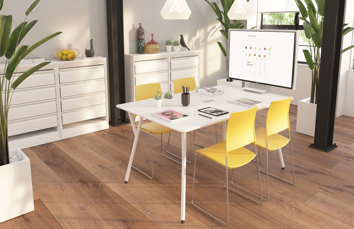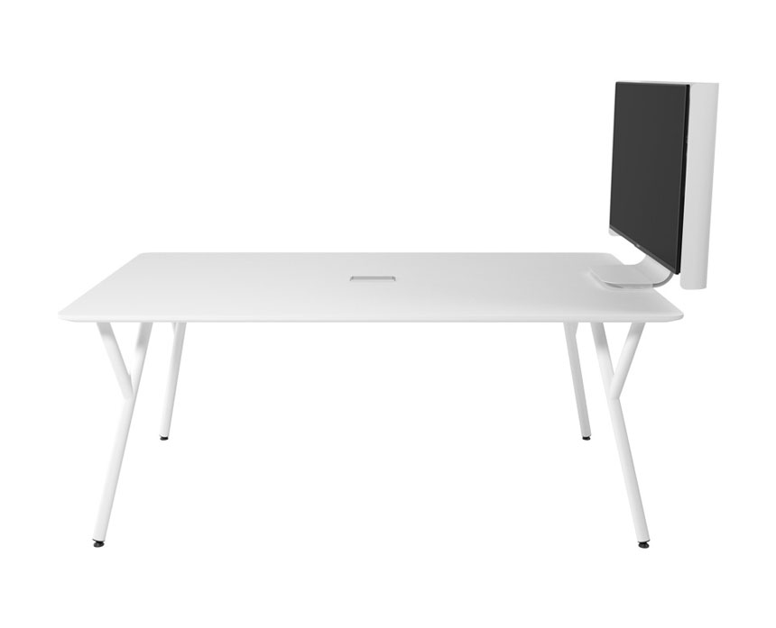 A Mesa Yes com Suporte para TV vem em dois tamanhos e tem duas opções de altura e pode ser usada para compor ambientes colaborativos em escritórios e bibliotecas.