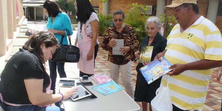 Os alunos dos cursos de Enfermagem, Gestão de Serviços de Saúde, Nutrição e Medicina são responsáveis pelo atendimento para empréstimos, cadastramento das pessoas em um banco de dados e combinar a data para devolução e apresentação da sinopse dos livros aos interessados.